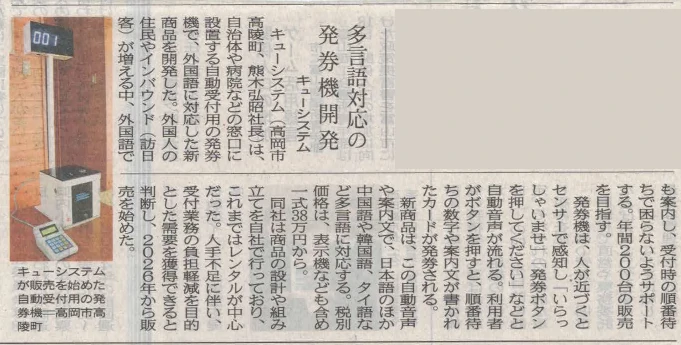 今回の記事では、弊社の新製品 窓口受付システム「自動窓口受付機(QS-TK100-SP)、表示機、操作機」や、自治体・公共施設での導入事例について取り上げられました。